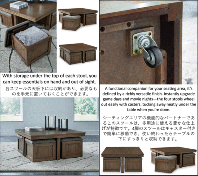 ローテーブル 2025.10.08 【61,225円】T738-20 Coffee Table with 4 Stools Data : コーヒーテーブル/ベンチ4脚SET $395 40″ W x 40″ D x 18″ H / 1016mm 幅 x 1016mm 奥 x 457.2mm 高